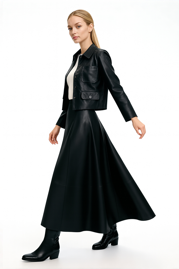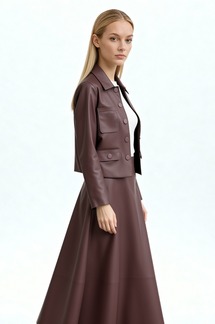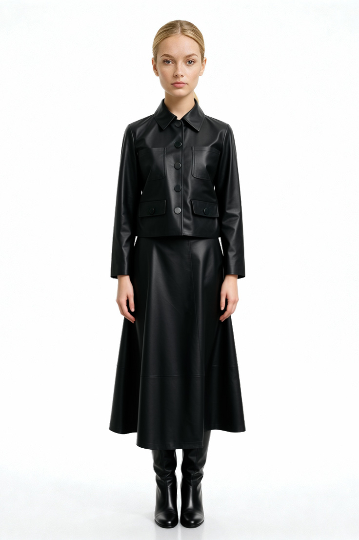 أضيفي لمسة جريئة إلى خزانة ملابسك مع جاكيت الجلد الأنيق هذا. يتميز الجاكيت بقصّة مرتبة، ويشتمل على أكمام طويلة دافئة وأزرار أمامية كلاسيكية لإطلالة متكاملة وعصرية. هذا الجاكيت هو القطعة المثالية لارتدائها فوق مختلف الملابس لإضافة لمسة مميزة على الفور.