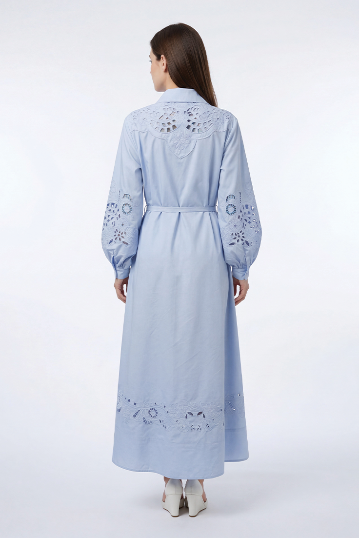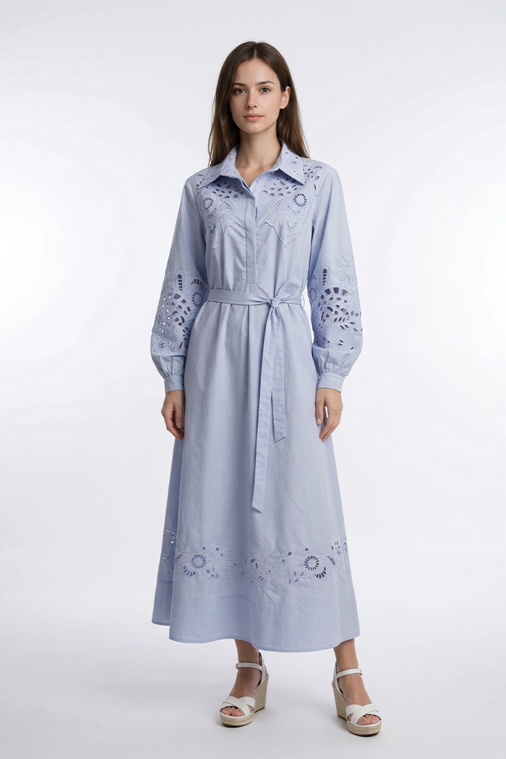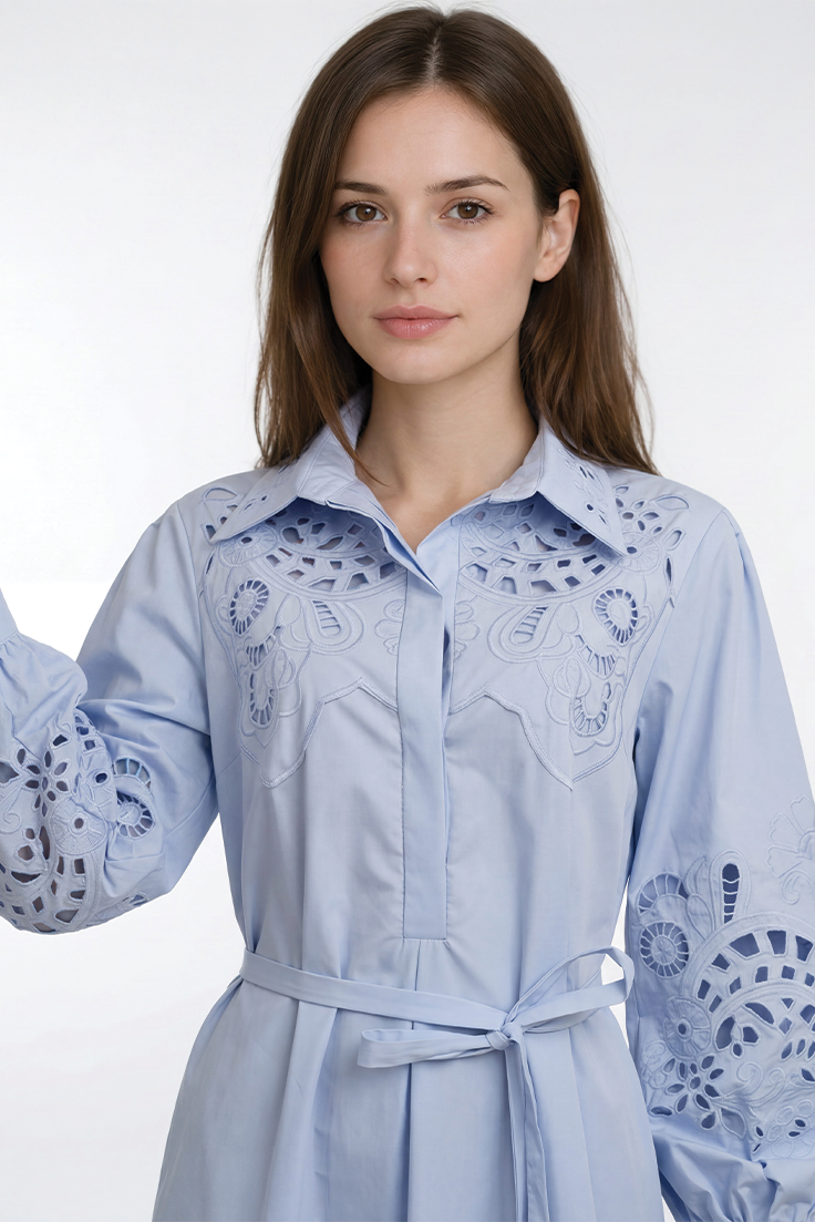 - تفاصيل تطريز مفرغ مبطنة على الصدر والأكمام
